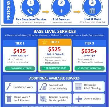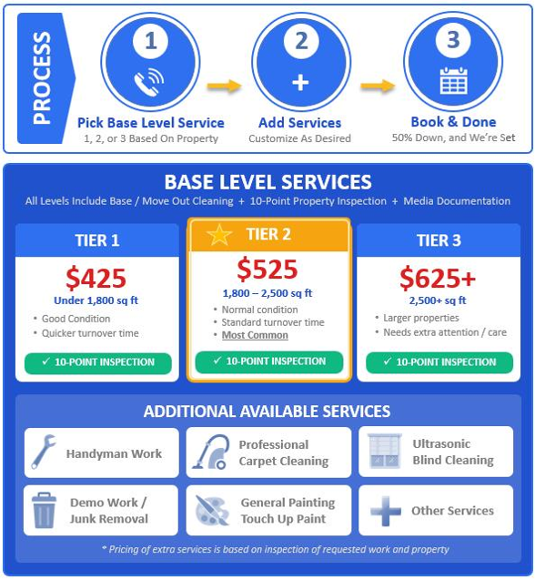 The great thing about PROPERTY TURN VALET is you have a pathway for MORE -- whatever you might want or need -- via our service. If a property needs more, just tell us what the "more" is, and we'll chart a course to get it done for you. Click HERE for a list of other things that can be obtained via our service.